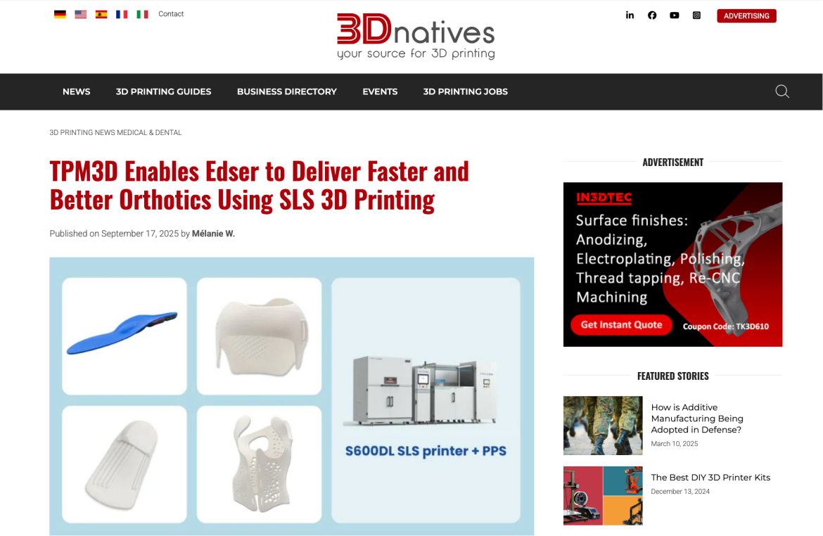 近日,盈普三維(TPM3D)與西班牙醫(yī)療企業(yè) Edser 的合作案例獲得全球 3D 打印資訊權(quán)威平臺 3Dnatives 專題報道。